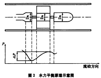 由于流体通过涡轮时会对涡轮产生一个轴向推力,使轴承的摩擦转矩增大,加速轴承磨损,为了消除轴向力,需在结构上采取水力平衡措施,这方法的原理见图2所示。由于涡轮处直径DH略小于前后支架处直径Ds,所以,在涡轮段流通截面扩大,流速降低,使流体静压上升△P,这个△P的静压将起到抵消部分轴向推力的作用。