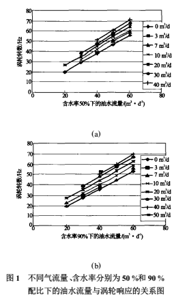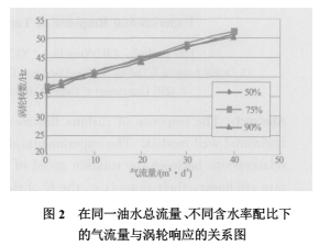 图1中分别给出了不同气流量、油水两相含水率分别为50%和90%下的油水总流量与涡轮响应的关系。