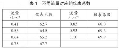 其中自变量为流量,因变量为仪表系数。当流量介于0.4~1L/s时,采用式(1)进行计算;当流量超过1.1L/s时,保持仪表系数恒为69.9。