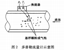 多普勒法是利用声学多普勒原理确定流体速度。多普勒原理是若声源和目标之间有相对运动,会引起声波在频率上的变化,频率变化正比于运动的目标和静止的换能器之间的相对速度。图2是超声多普勒流量计示意图。发射晶体T1发射的超声波遇到流体中运动的颗?;蚱莘瓷浠乩从山邮站錜1接收,发射信号与接收信号的多普勒频率偏移与流体速度成正比。忽略管壁影响,假设流体没有速度梯度且粒子是均匀分布的,可得: