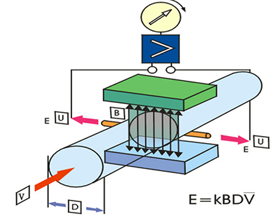 电磁流量计的工作原理是基于法拉*电磁感应定律。在测量管内的导电介质相当于法拉*试验中的导电金属杆,上下两端的两个电磁线圈产生恒定磁场。当有导电介质流过时,则会产生感应电压。管道内部的两个电*测量产生的感应电压。