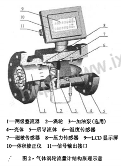 气体涡轮流量计是速度式流量测量仪表。当流体流入流量计时,在前导流体(或整流器)的作用下得到整流并加速,由于涡轮叶片与流体流向成一定角度,此时涡轮产生转动力矩,在克服摩擦力矩和流体阻力矩后,涡轮开始旋转。在一定的流量范围内,涡轮旋转的角速度与流体体积流量成正比。根据电磁感应原理,利用磁敏传感器从同步转动的参考轮上感应出与流体体积流量成正比的脉冲信号,该信号经放大、滤波、整形后送入智能体积修正仪,与温度、压力等信号一起进行运算处理,分别显示于LCD屏上。其结构原理图如图2。