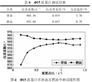 依据表5测试数据,经计算可得,Φ15流量计在滑油及燃油中测试结果如表6所示,测试线性图如图4所示。
