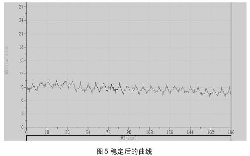 图4、图5中所示曲线为测量过程中所截取的集流伞中所聚集的气相,通过排气通道排出时与排出后的测量曲线。测试过程中录取到的仪器排气的过程,当集流伞完全支开后仍需要开启流量测试进行实时检测,否则可能会录取资料失真。