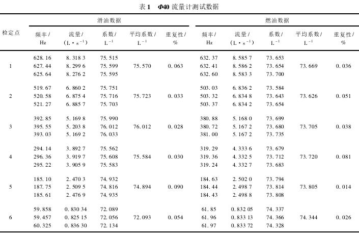 依据表1测试数据,经计算可得,Φ40流量计在滑油及燃油中测试结果如表2所示,测试线形图如图2所示。