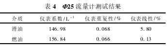 依据表3测试数据,经计算可得,Φ25流量计在滑油及燃油中测试结果如表4所示,测试线形图如图3所示。