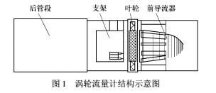 涡轮流量计结构示意图如图1所示,主要组件包括前导流器、叶轮、支架以及后管段。流体从机壳进口流入,*先经过前导流器,前导流器对流体流动有如下两个重要作用: