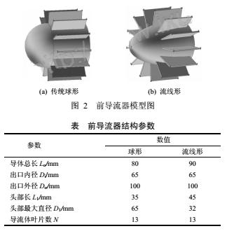 由于ρ和v为流体流动参数,不能随意增减,因此只能尽量减小压损系数α,以达到降低压损的目的。压损系数除了受流体粘性、管径及管长等因素影响外,与流量计内部各部件的几何结构有密切关系。文献通过试验发现叶轮的形线、叶片数对压力损失的影响较小(≤3%),因前导流器对流量计有着重要作用,故将传统的球形前导流器改进为流线形,考察两者在流动减阻方面的不同,进而分析对流量计性能的影响程度。DN100涡轮流量计改进前后的前导流器结构如图2所示,几何参数见下表。