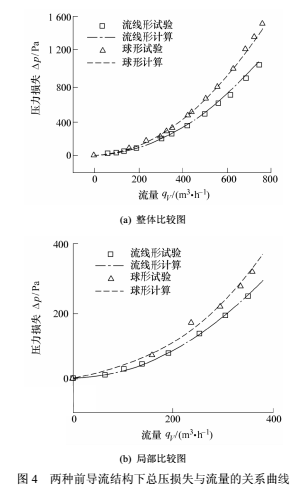由图4可知,两种结构下的计算与试验值符合很好,误差在全量程范围内均小于5%。在小流量(≤200 m³/h)区,无论是计算值还是试验值,两种结构的压损值相差非常小,说明前导流结构在流量较小时对压损的影响不明显。随着流量的增大,结构导致的压力损失出现了较大差别,明显看到,流线形与球形的数值差距越来越大,在*大流量处(约 750 m³/h),球形压损比流线形增大约30%。