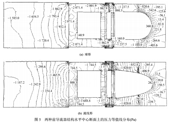 图5为两种前导流器结构水平中心断面上的压力等值线分布,宏观上,图5a、5b的压力变化趋势是一致的:在前导流器、叶轮和支架部分,压力均不同程度地降低,由支架进入尾流区后,压力逐步上升。