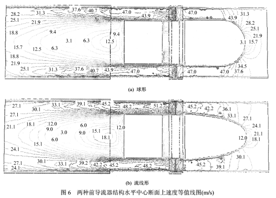 图6为与图5相同位置上的速度等值线分布。在前导流器处,可看出对应压力变化剧烈的区域,速度变化也较大。球形头部速度急剧增大、直管段速度几乎不变的分布趋势使其中心出口速度(47.0m/s)较大(流线形45.2m/s),在同流量下表明球形前导流器具有较大速度梯度。当气流进入尾流部分后,由于流道突扩,在支架的背面形成明显的低速涡区,之后管壁附近速度降低,中心区主流速度回升,速度值被逐渐拉平,对应压力也逐步回升??煽吹?,至出口断面,流线形的速度不均匀*大差值为6.0m/s,球形为9.4m/s,即球形的出口速度梯度更大,压力回升则相应较慢。