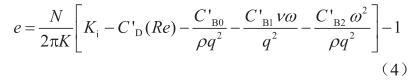 式中q表示体积流量,m3/s;ν表示介质的运动黏度,m2/s;雷诺数Re=4q/(πdν);d表示流量计口径,m;ρ表示介质的密度,kg/m3;C'D、C'B0、C'B1和C'B2分别表示4个待定系数,在某个流量点下标定出的仪表系数(Kf,表示单位体积流体通过流量计时,流量计输出的脉冲数,1/m3)和转子叶片频率(f,s-1)的关系为: