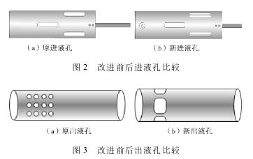 防砂卡防爆涡轮流量计结构如图1所示,主要由防爆涡轮流量计、筛状出液孔、防爆涡轮流量计安装短接、解卡管、解卡管开槽、中心管、长条孔(销钉运动槽7)、薄壁筒、进液孔、解卡管固定销钉、含水传感器安装筒组成。采用等效面法,将进液孔一分为二,改为宽2mm的矩形进液孔,解决从进液孔进入的长垢片或大垢片造成的砂卡,如图2所示。将原先3个方型的出液孔改为直径4mm的阵列状的筛孔,解决仪器在下井过程中从出液孔进入仪器的长垢片、大垢片造成的砂卡,如图3所示。