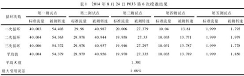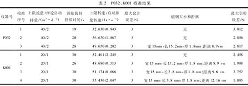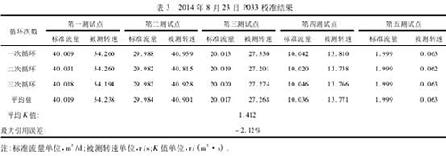 表1为2014年8月24日P033*6次校准结果。本次校准平均K值1.301r/(m3?s),大于1.0r/(m3?s),同时*大引用误差为1.08%,小于*大允许误差3%,启动排量2m2/d时的平均转速1.850r/s,因此P033校准合格。同样,P032、K001、K018先后校准合格。因此,在启动排量、*大允许误差合格的前提下,K值大于等于1,K值可以评价解卡管、进液孔、出液孔造成的局部阻力损失。