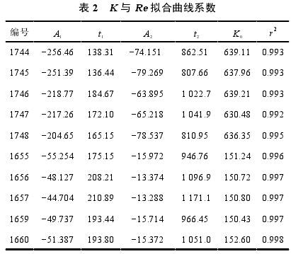 利用双指数衰减函数对仪表系数与雷诺数关系进行拟合,在层流范围内(Re<2300),仪表系数随Re增加迅速增加,尤其是在Re<1000范围内更加明显;而在Re>3000紊流范围内,仪表系数变化平缓,接近常数;在1000