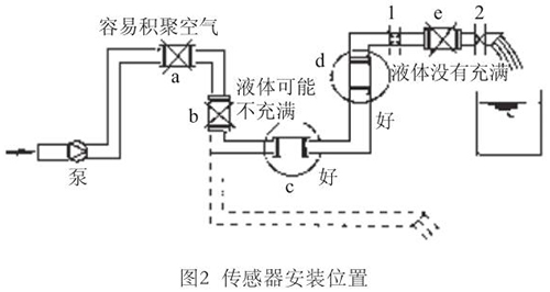 液体流动方向必须与传感器壳体上箭头方向一致。对于能正反向测量的冷冻水回水流量计,若方向不一致虽仍可测量,但设定的显示流动正反方向不符,必须改正之。若拆传感器工作量大,也可改变传感器上箭头方向和重新设定显示仪表符号。管道未充满液体主要是管网工程设计或传感器安装位置不妥,使传感器测量管内不能充满液体。应采取措施,避免安装如图2所示a,e位置和以虚线管排放时b位置,改装到c,d位置。