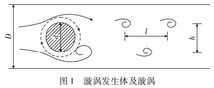 气体涡轮计量表是由漩涡发生体、频率检测器和信号转换器等环节组成,输出 4 ~ 20 mADC 信号或脉冲电压信号。其测量原理是在流动的流体中的垂直流动方向安放 1 根或多根非流体型阻流体,在一定的流量范围内,流体在阻流体两侧交替地分离、释放出 2 串频率正比于管道内的平均流速、规则的、不对称有规律的交替漩涡列,如图 1 所示,且两侧漩涡旋转方向相反。采用检测元件测出漩涡频率就可以推算出流体的流量。
