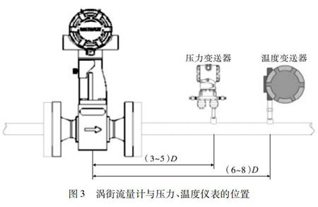 气体涡轮计量表的口径如果与工艺管道相同,不能满足流量仪表要求时,或者在此流速下测量准确度不能保证时,需要缩小仪表口径,从而提高管内流速,保证测量精度。上下游必须有足够的直管段,若传感器安装点的上游在同一平面上有 2 个 90°弯头时,上游直管段≥25D,下游直管段≥5D。根据测量的需要,需在气体涡轮计量表附近测量压力和温度时,测压点应在传感器下游的( 3 ~ 5) D 处,测温点应在传感器下游的( 6 ~ 8) D 处,如图 3 所示。