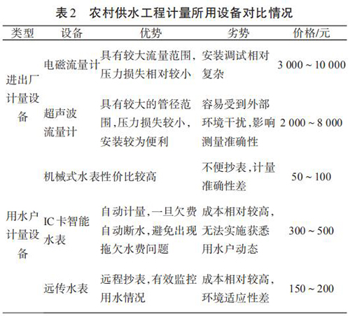 从现阶段来看,农村供水工程进出厂水计量设备主要采取的为液氧流量计、超声波流量计,而用水户计量设备主要包括机械式水表、IC卡智能水表、远传水表等。这些设备在实际使用过程中都有自身的优缺点,同时在价格方面存在较大差异,其具体情况如表2所示。