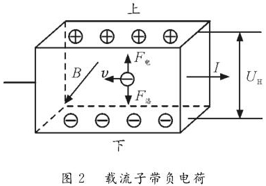 反之,如图2所示,若载流子带负电荷,则载流子在洛伦兹力作用下会向下偏转,导体下表面积累负电荷。同时,上表面失去负电荷而带上正电,从而使上表面电势高于下表面。