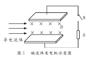 【例1】图5为磁流体发电机示意图。设两金属板间的距离为d,两*板间匀强磁场的磁感应强度为B。等离子体垂直进入磁场的速度为v,单个离子所带的电荷量为q。离子通道(即两*板内所围成的空间)的等效电阻为r,负载电阻为R。则下列判断正确的是( ?。?br /> A。该发电机的电动势E=Bdv