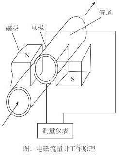 冷却水流量计是应用电磁感应定律,即:导电体在磁场中运动产生感应电动势,而感应电动势又和流量大小成正比,通过测电动势来反映管道流量的原理而制成的,用来测量导电流体的体积流量(见图1)。工业上多用以测量水、矿浆、各种酸、碱、盐等腐蚀液体等介质的流量。