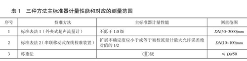 三种方法标准器的测量范围应覆盖被校流量计的测量范围。标准表法 1 中,超声波流量计在实验室不同管道口径和不同管道材质标定的系数各不相同,为提高在线校准准确度,应将超声流量计的换能器探头在实验室用不同管径、不同材质的管道进行流量修正系数的标定,标准表现场使用时的条件与实验室溯源的条件应保持一致或接近。
