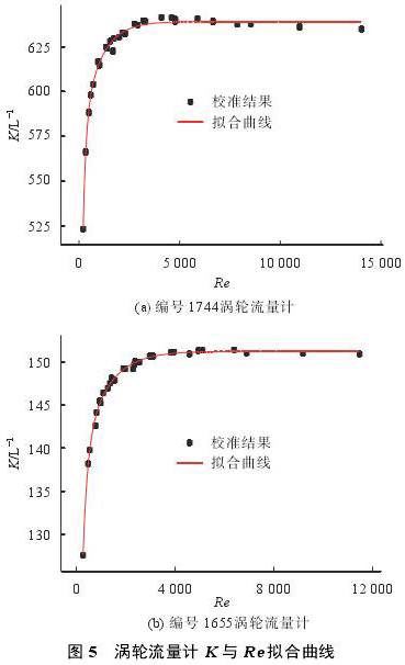 图5是1744和1655两支甲醇流量计Re与K拟合曲线图。表2是流量计拟合曲线系数。通过r2值对拟合度进行评估,10支甲醇流量计拟合优度值处于0.992~0.998之间,拟合结果非常好。