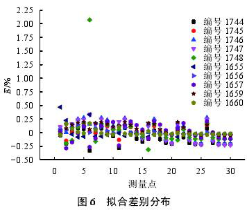 选取与以上要求的9个关键雷诺数相近的流量点数据进行拟合,并与全数据拟合结果进行比较,两者差别通过式(9)进行评估。图6是两种拟合方式差别分布情况。300对数据点中,仅有1点仪表系数差别超过2%,其他各点差别均小于0.5%,而且99%以上的数据点差别小于±0.33%,86%以上的数据点差别小于±0.20%。