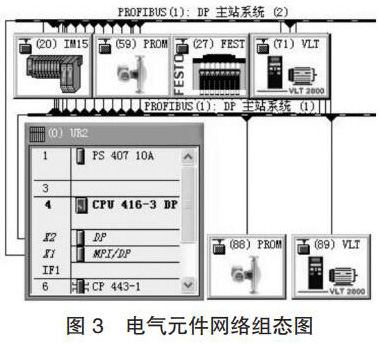 (1)电气元件组态。把增加的质量流量计和变频器添加到香料厨房 S7-400 PLC 控制系统的 PROFIBUS 网中,其网络组态如图 3 所示,图中 PROFIBUS-DP 地址 88 和 89 为硬件系统增加的质量流量计和变频器。