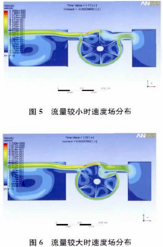 图9记录的是切向涡轮正常转动时的流场,图9中水从左向右流动,实验时水速较快(1m3/d),涡轮叶片顺时针转动。水速变大后,扰动变大,不再是无旋绕角流动,腔体1中流体形成一个运动的旋涡,导致腔内压强分布不再对称,产生压差,致使涡轮叶片转动,旋涡在随叶片运动到腔体2中时逐渐耗散消失。数值仿真的计算结果与物理实验的结果基本一致。