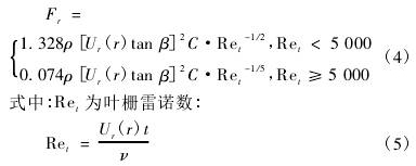 式中:Cl和Cd为叶栅的升力系数和阻力系数,二者可通过不可压缩势流的方法计算,与叶片翼型、叶轮转速、来流速度和半径位置等参数相关。