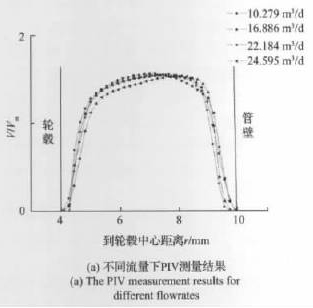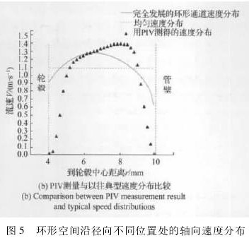 实验中流量计的涡轮轮毂半径为4mm,而管道内径为10mm,因而速度分布都在这6mm的区间内。通过图像处理可以获得32个不同位置的速度,在此基础上进行插值即可获得整个环空流场的轴向速度分布。图5(a)反映了实验所测得的几个不同工况点的轴向速度分布,从图中可以看出,流速在中间位置较高,由于边界层的影响,在靠近轮毂和管壁附近流速逐渐趋近于零。随着流速的升高,整体速度分布向管壁方向偏移,速度*大值位置半径增大,轮毂表面边界层厚度增加,管壁表面边界层厚度减少。与Xu采用LDA测量的结果相比,本文结果在半径较大处速度较高,二者的不同结果也反映了不同设计的柴油计量表入口速度分布存在差异。相比LDA而言,PIV可以更加全面地获得轮毂与管壁之间的流速分布信息。