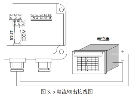 使用电流输出线(4-20mA)时,应注意到导线的电阻与负载电阻之和不得大于 750Ω 。电流输出接线见图 3.5。