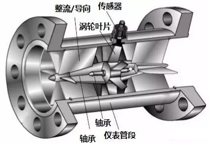 下图就是一款液体涡轮流量计的透视图,可以看到流量计的管道中心安放了一个涡轮,涡轮两端由轴承支撑。