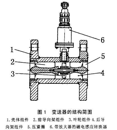 涡轮流量变送器的结构简图如图1 所示。它主要由壳体组件、叶轮组件、前后导向架组件、压紧圈和带放大器的磁电感应转换器所组成。当液体( 如液压油) 流过变送器时, 变送器内的叶轮借助于液体的动能而产生旋转, 叶轮即周期性地改变磁电感应系统中的磁阻值, 使通过线圈的磁通量发生变化而产生脉冲电信号, 经放大器放大后, 送至二次仪表进行显示或累计。在测量范围内, 叶轮的转速可看成与流量成正比, 而信号脉冲数则与叶轮的转速成正比, 所以当测得频率f 和某一时间内的脉冲总数N 后, 分别除以仪表常数毛( H z/ )L,便可求得瞬时流量Q ( L / S ) 和总量V ( L ), 即:Q= f/ 互(L / s)。