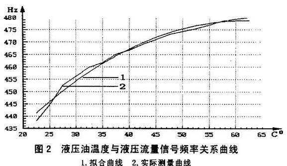 因为以上试验是在液压油流量变化的情况下测得, 如果要分析液压油温度对流量信号频率的影响, 就必须将液压油流量信号频率修正到某一不变的流量下( 如52 .07L/ m i n 。流量信号频率修正后, 如表2 所示。根据表2 对液压油流量信号频率的修正, 使用计算机绘制出液压油温度与液压流量信号频率之间的关系如图2 中的曲线2 所示。