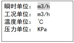 压力单位: 压力单位选择。显示单位选项可更改仪表运行时显示的单位,进入显示单位界面,标况流量如果选择为液体质量有 t/h、t/min 、kg/h 和kg/min 四个选项选择,如果为液体体积有 m3/h、m3/min 、L/h 和 L/min 四个选项选择;工况流量有 m3/h、m3/min 、L/h 和 L/min 四个选项选择,选择相应的单位,按确认键后,主界面将以设置显示单位进行数值显示。