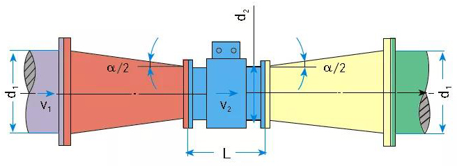 所以在有些流速偏低工况下,为了使污泥流量计工作在合适的流速范围,允许有一定的压力损失时,可以选择流量计传感器的口径小于管道口径,在仪表前后增加异径管,提高介质流速。异径管的中心锥角α不大于15°,可以视为直管,如图5。