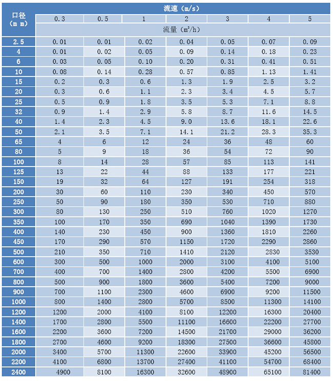 (3)流量计流速、口径、流量对应表