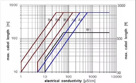 以某品*污泥流量计选型样本提供的电导率和电缆长度曲线为例,其中A型电缆为双芯双屏蔽DS300、B型电缆为双芯三屏蔽BTS300。像浙江省一般水库原水电导率在100us/cm左右,安装所需电缆线小于100米,选A型即可,超过100米,需要选B型。