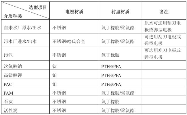 电*对被测量介质的耐腐、抗磨蚀、无电化学反应是选择材质考虑的因素。常用金属材料有含钼耐酸钢、哈氏合金B、哈氏合金C、钛、钽、铂铱合金等。由于介质种类繁多,其腐蚀性又受温度、浓度、流速等复杂因素影响而变化,生产厂仅能给出很粗略的各种电*的适用范围。电*材质的选择可从使用者借鉴该介质在其他设备的应用实例和以往的经验来确定。浙江某自来水厂用于计量5-10%次氯酸钠投加,电*材质选择了哈氏合金,在运行使用1年多的时间后,出现传感器故障,返厂检测发现电*腐蚀,后我司选择钛电*材质,现运行情况良好。水行业常规选型详见表2。