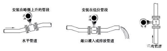 流量计可以水平、垂直和倾斜安装。但是管路结构应保证测量管必须始终充满液体(满管)。管路设计时注意确保测量管段无气泡,否则将会造成测量不稳定和偏差过大。