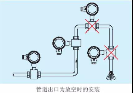 当出口为放空状态时,传感器不应安装在管道放空之处,应安装在较低处。传感器安装在管道下方处时,应保证传感器内被液体充满,不能出现空管状态。