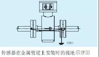 a.传感器在金属管道上安装(金属管道内壁没有绝缘涂层),按下图接地。