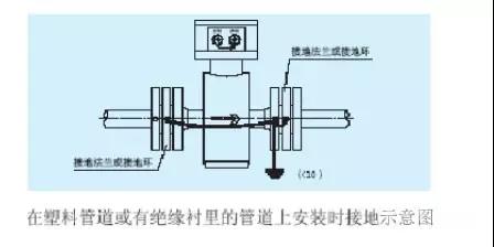 b.传感器在塑料管道上或在有绝缘衬里的管道上安装,传感器的两端应安装接地环、或接地法兰、或带有接地电*的短管,按下图接地。使管内流动的被测介质与大地短路,具有零电位,否则,补水流量计无法正常工作。