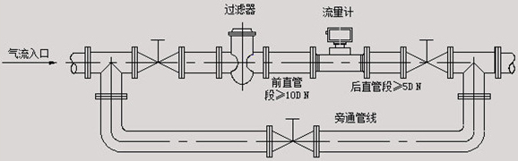 涡轮流量计的安装有法兰连接、螺纹连接及夹装式三种方式。安装时液体流动方向应与传感器外壳上指示流向的箭头方向一致,且上游直管段应大于等于20倍管径,下游直管段大于等于5倍管径。