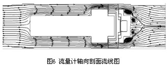 以流量Q=250m3/h的数值模拟计算结果为例进行涡轮流量计内部流场及压力场的分析,图5为涡轮流量计轴向剖面静压分布图,前导流器前后的压力场分布较均匀且压力梯度较小,在机芯壳体与叶轮支座连接凸台处压力有所增加,连接面后压力又逐渐减小,故认为流体流经叶轮支座产生压力损失的主要原因是连接处存在凸台,导致流场出现较大变化,不能平滑过渡,建议将叶轮支座与机芯壳体的连接改为圆弧线型或流线型。观察图5和图6,当流体流经叶轮从后导流器流出涡轮流量计时,压力梯度变化明显,存在负压区域并造成很大的压降,在后导流器凸台及流量计出口处速度变化明显,由于气流通过后导流器后流道突扩,在后导流器背面形成明显的低速涡区,产生了漩涡二次流。