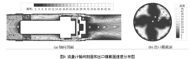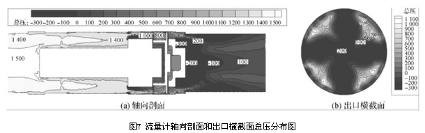 结合图7、图8流量计轴向剖面和出口横截面的总压及速度分布图,其速度分布与压力分布相似,流量计流道内速度分布较均匀的区域其压力梯度变化也较小,即流道内速度的分布和变化与压力损失大小相关。由流量计轴向剖面和出口横截面的速度及压力分布图可以看出,流量计后导流器处产生的漩涡二次流影响了出口横截面处的速度及压力分布