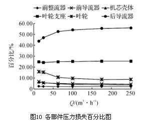 观察图10各部件压力损失百分比图,可见前整流器、前导流器和机芯壳体处的压力损失很小,叶轮支座处压力损失约占总压力损失的1/4。前整流器所占压力损失比例在各流量点基本保持不变,前导流器和机芯壳体处的压力损失随流量的增加其比例略有降低,叶轮支座处压力损失随流量的增加其比例略有增加,但总体上受流量影响不大。叶轮处的压力损失随流量从13m3/h增加至250m3/h,其比例从15.88%降至8.71%,降幅明显,后导流器处的压力损失占总压力损失的大半,随着流量从13m3/h增加至250m3/h其压力损失比例由43.77%升至55.83%,增幅明显。总之,后导流器、叶轮支座和叶轮是流体流经涡轮流量计产生压力损失的主要影响部件,可通过优化其结构以降低涡轮流量计的总压力损失。